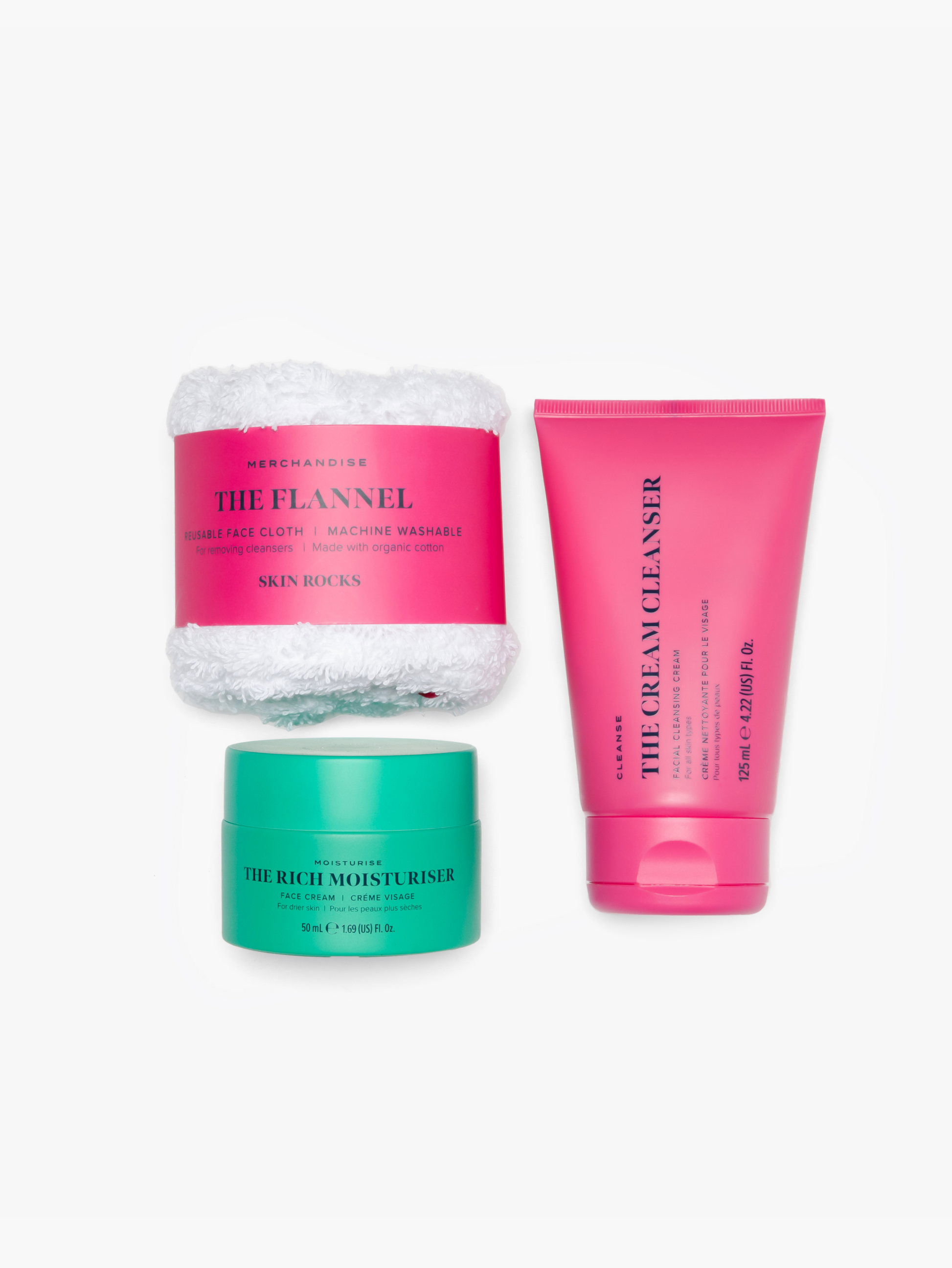 Cleanse and nourish your skin with our skincare staples, The Cream Cleanser and The Rich Moisturiser, plus our best-selling Flannel. For dry and/or mature skin.