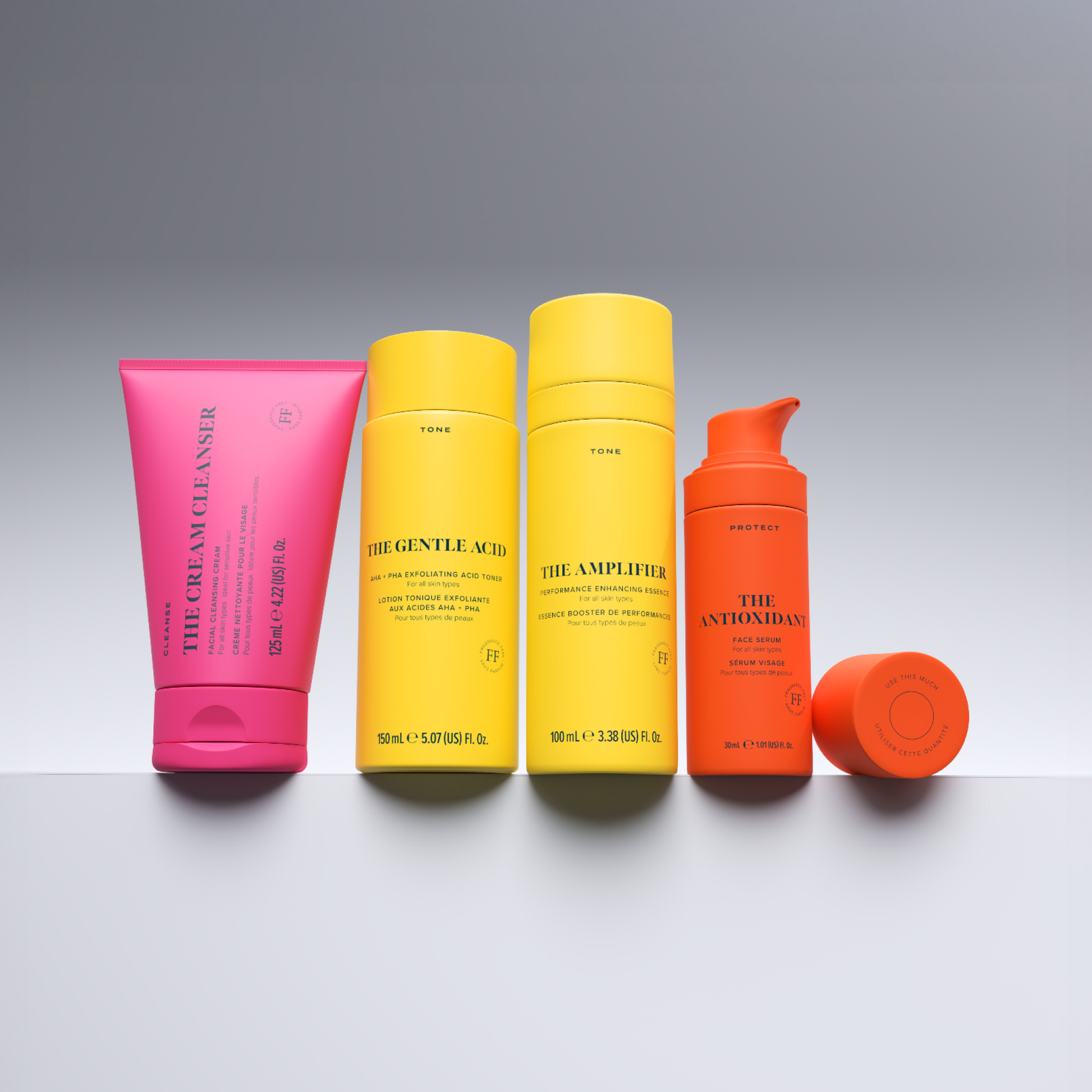 Curated specifically to replicate Caroline’s personal glow routine, these four failsafe formulas work together to unlock proven glow, elasticity, firmness, and luminosity.Start with our conditioning The Cream Cleanser to gently cleanse the skin whilst respecting your barrier, then sweep the Gentle Acid’s AHA/PHA exfoliating formula over skin to visibly even tone, minimise the appearance of visible pores and refine skin texture. Follow with The Amplifier to drench skin in hydration and active-boosting ingredients before adding your serum step, The Antioxidant, to deliver supreme daily protection and instant luminosity.